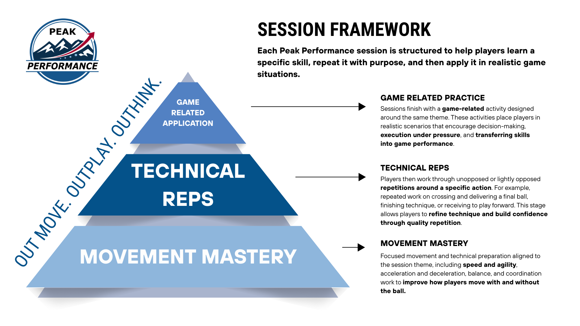 Aligned with the training principles and development frameworks used by top academies, Peak Performance is designed to help players improve their individual game in ways that transfer directly to match performance.